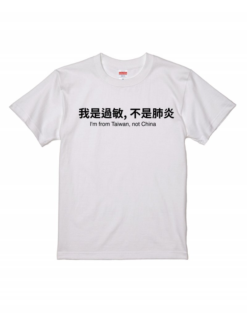 ▼這件素色的T-Shirt設計簡單,正面印著中文「我是過敏,不是肺炎!」簡單8個字替過敏的人說出心聲。中文標語下方還有一行英文:「I’m From Taiwan, not China.」