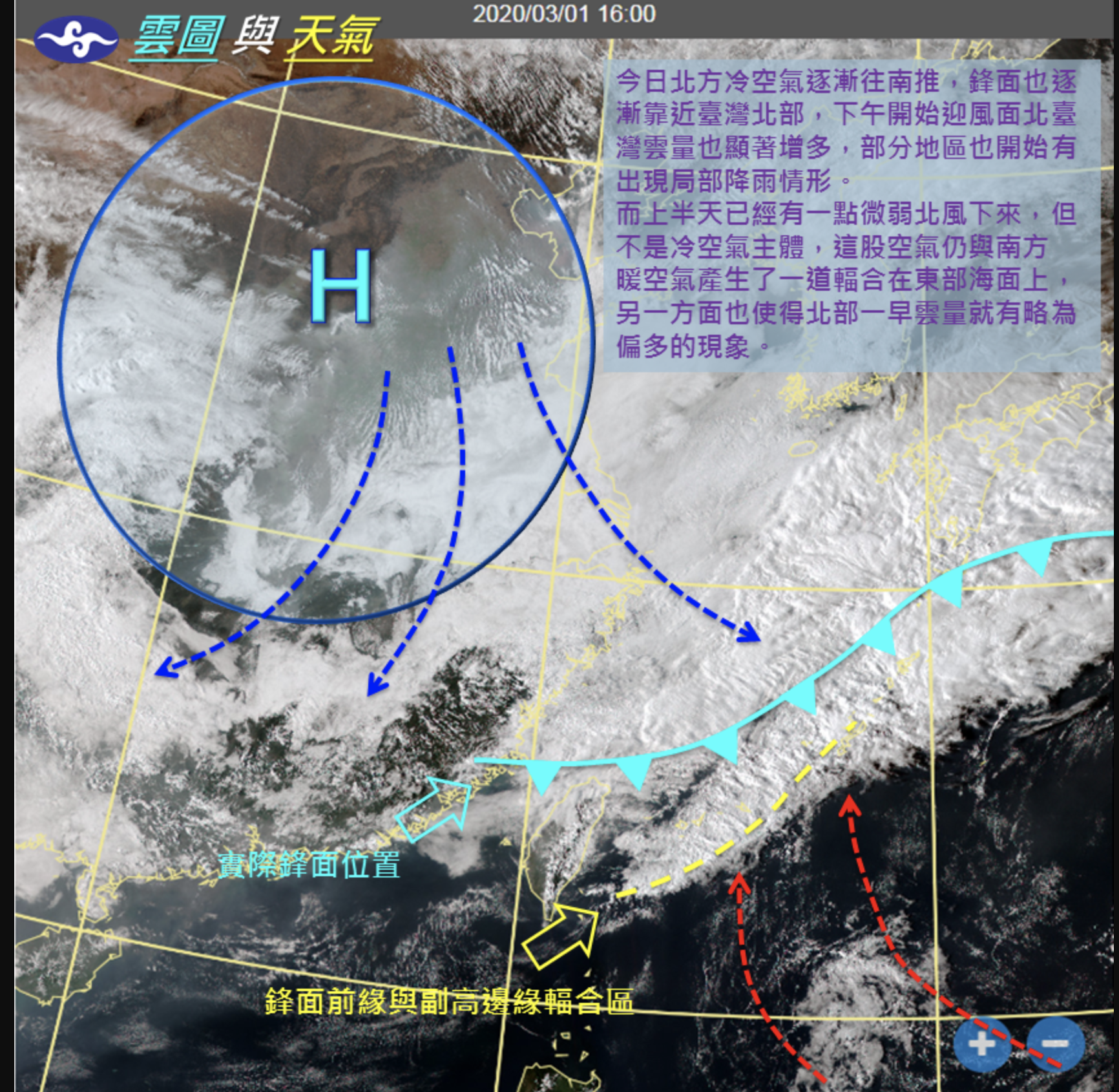 ▼據氣象局報導,3月1日鋒面通過,上午各地為多雲到晴的天氣,下午北部及東半部地區雲量增多、偶有局部短暫降雨;溫度方面,白天各地舒適、溫暖,北台灣及東北部高溫約24至26度,其他27至30度,下半天鋒面通過之後東北季風開始增強,北台灣逐漸轉涼,今天(2日)清晨北台灣的氣溫會降到16度左右,其他低溫變化不大約17至20度。