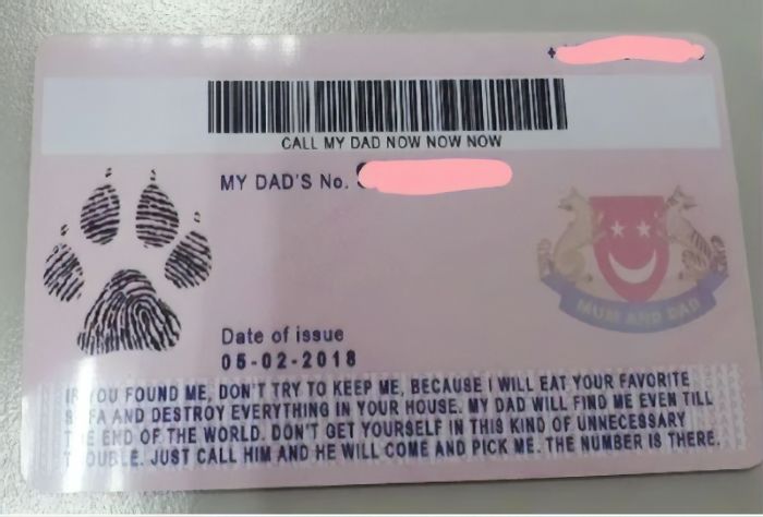 2020年03月05日人類有身分證,作為我們的好夥伴,寵物能不能擁有自己的身分證呢?新加坡商家推出了一款專為毛孩設計的ID卡,上面不僅有毛孩的照片,還有詳細的資料,包括姓名、地址等等。只看一眼就能知道毛孩的背景。