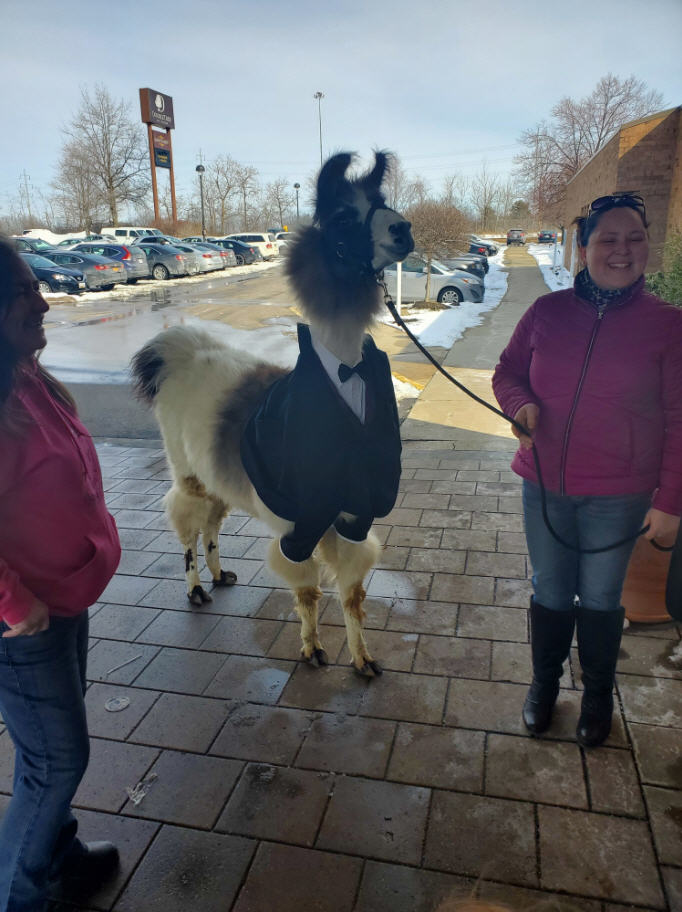 ▼去年10月妹妹訂婚,Mendl決定遵守承諾。他花400美元(約台幣11,966元)預租了一隻叫Shockey的大羊駝,還給大羊駝訂做了西裝、小圓帽。妹妹的婚禮這天,Mendl真的帶著大羊駝一起來了。