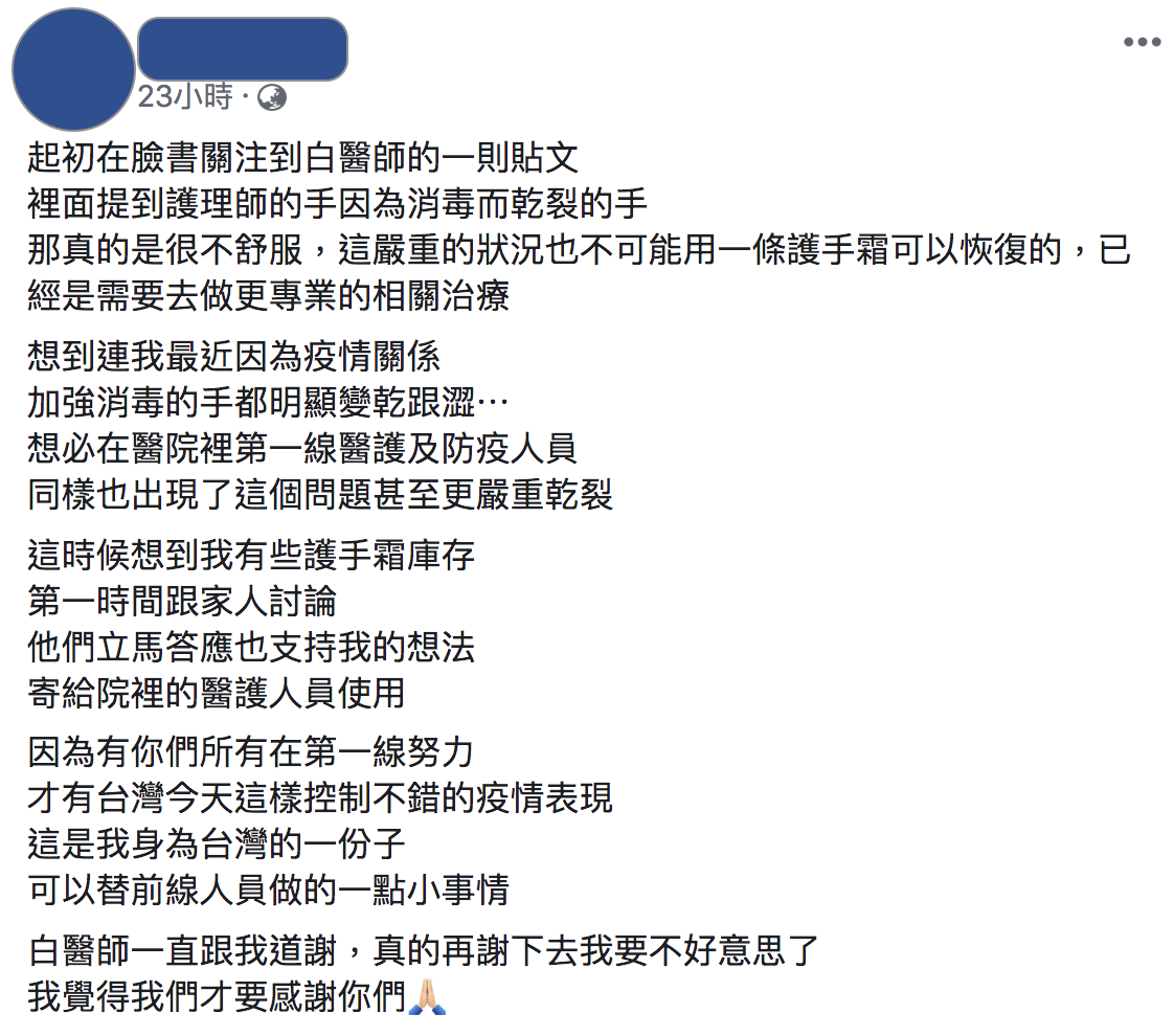▼郭小姐在個人臉書分享了白醫師的貼文,她表示起初是因為關注到白醫師過去在貼文中提到護理師的手因消毒而乾裂,才將家裡的護手霜庫存寄給醫院:「重點不是在於郭小姐是誰,重點是我希望護手霜真的有滋潤到大家的手」;文末她更謙虛地表示,比起她的舉動,醫護的努力才是更值得感謝的:「我覺得我們才要感謝你們(醫護人員)。」