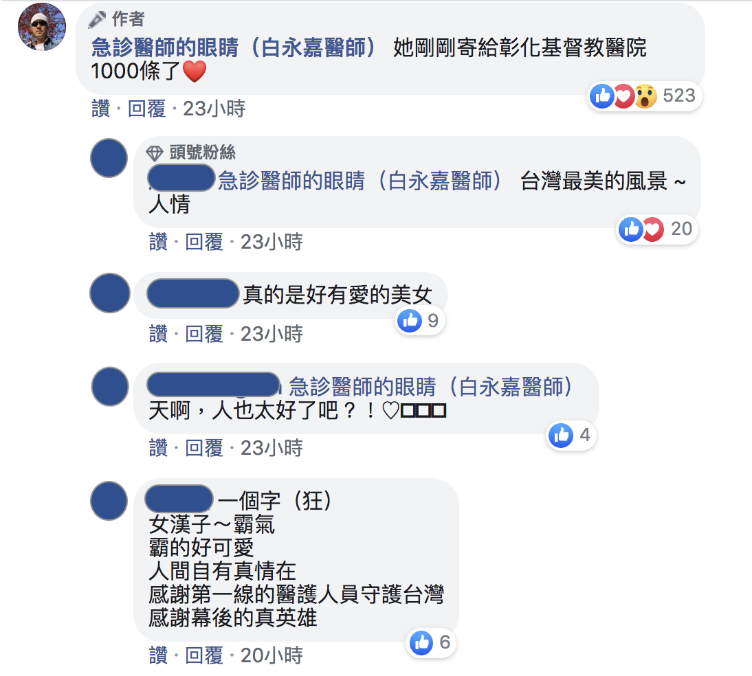 ▼白醫師文末加上附註,說這位善良的郭小姐還表示若有其他單位需要,歡迎在留言註明醫院地址、收件人與需要數量,郭小姐會主動跟各院方聯絡寄護手霜;而在留言處,也能看到白醫師更新資料「她剛剛寄給彰化基督教醫院1000條了」;網友們則紛紛讚賞「台灣最美的風景」、「人也太好了吧」。