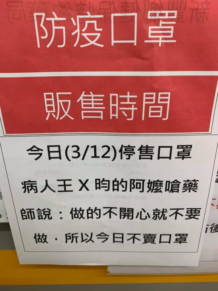 ▼照片中的公告上寫著:「今日(3/12)停售口罩,病人的阿嬤嗆藥師說:『做的不開心就不要做』,所以今日不賣口罩。」