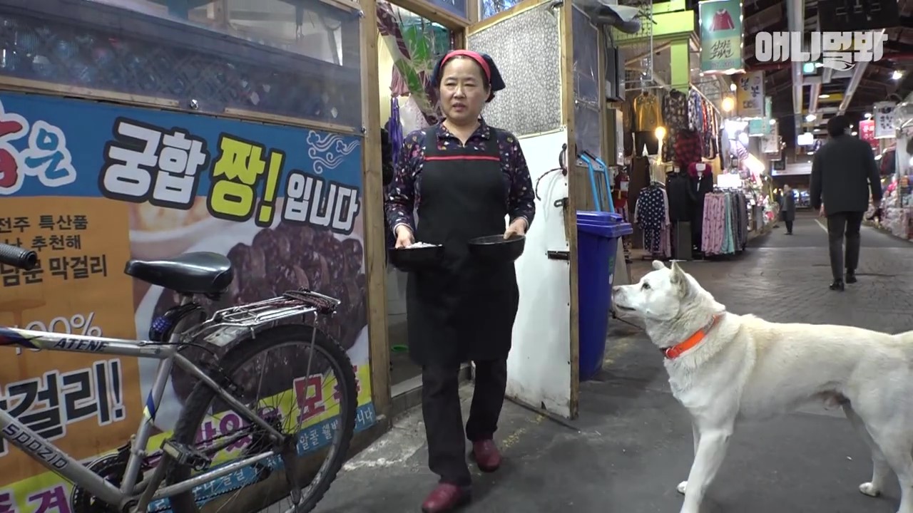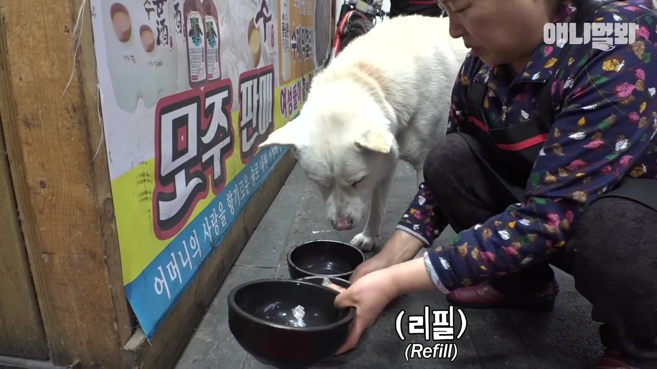 ▼Simdol來到小吃店門前對著老闆娘搖尾巴示好,善良的老闆娘就會拿出滿滿的一碗肉肉招待。因為Simdol常常來索要肉肉,有時甚至會吃掉兩碗肉肉,老闆娘一度認為飼主沒有餵飽牠。