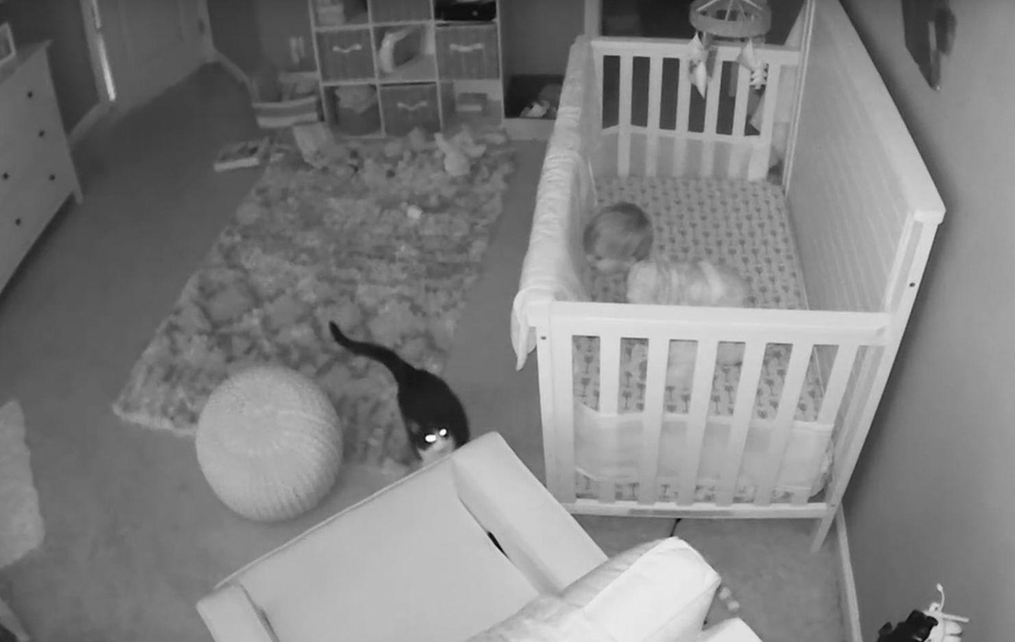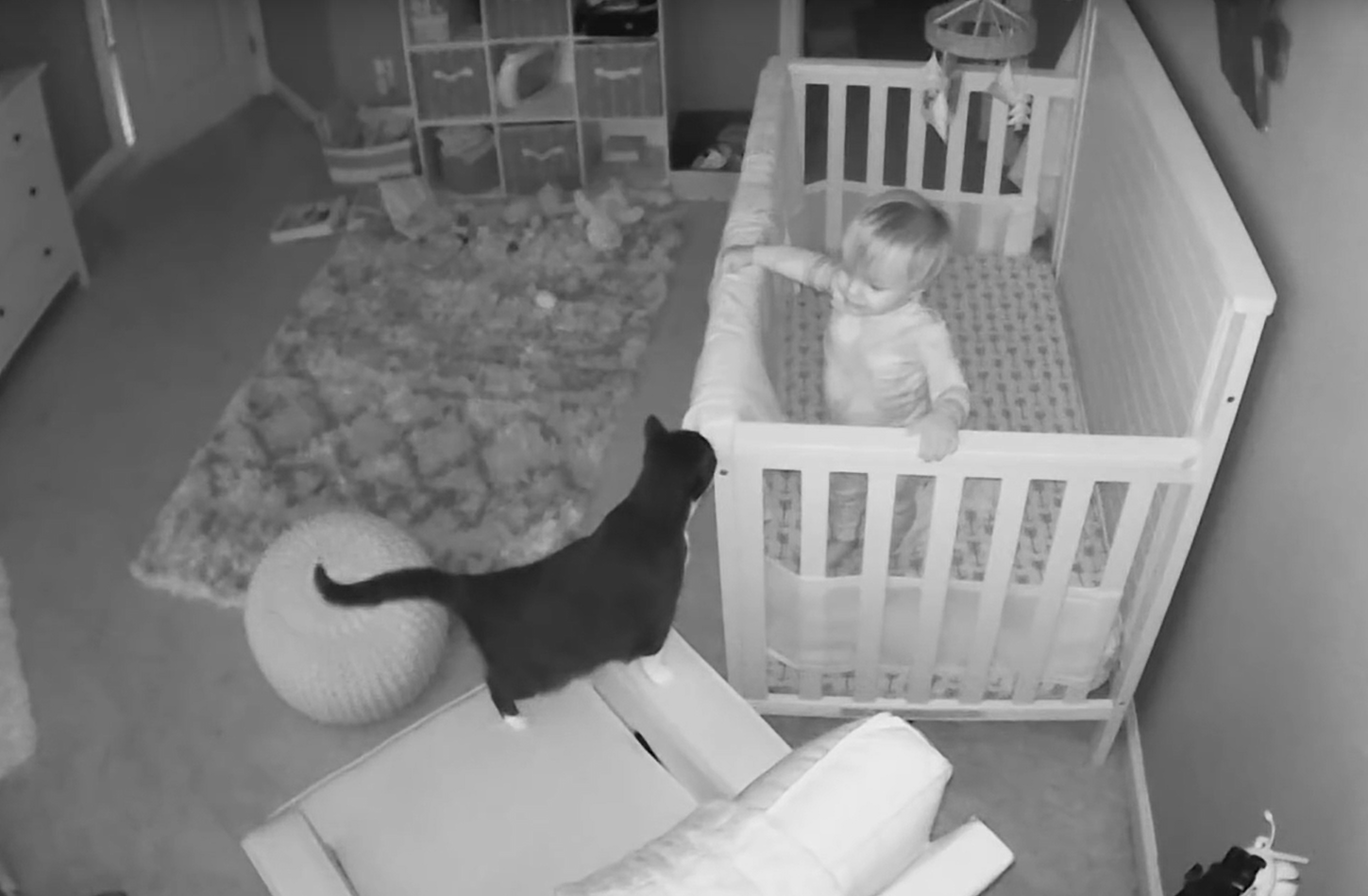 2020年03月16日半夜不睡覺的不只有貓咪,還有家中1歲半的小主人。國外一對夫婦家中養了一隻可愛的貓咪,貼心的貓咪自覺成為小主人的「貼身護衛」。一天半夜,監視器中傳來了貓咪的叫聲,夫婦二人立刻查看狀況竟發現「超可愛」的一幕。與小主人「溫情對話」的貓咪還不忘保護小主人。