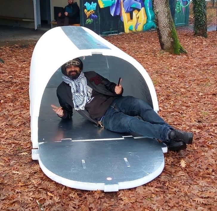 ▼幾年前Geoffroy曾在海外工作過一段時間,他回到巴黎時發現街頭有很多無家可歸的人,於是決定伸出援手。他準備用輕便、廉價、能禦寒的材質來為街友們設計臨時住所。