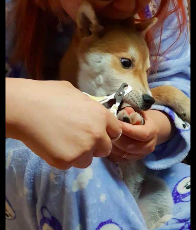 ▼飼主讓柴柴躺在自己的大腿上,開始給牠剪指甲。但每次碰到牠的指甲,牠都忍不住大喊大叫,連白眼都出來了。