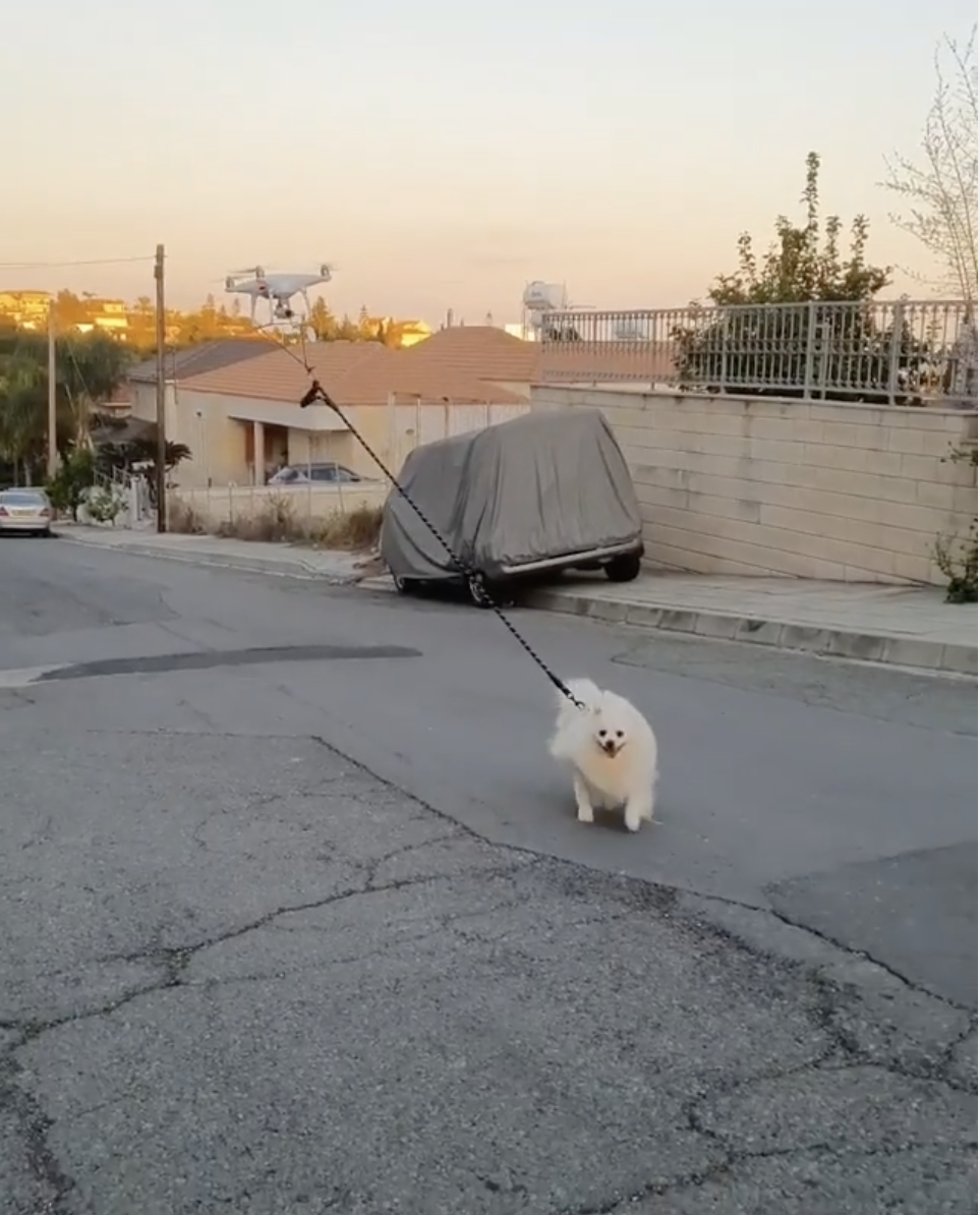 2020年03月24日全球武肺(COVID-19)大流行,當歐洲官方都奉勸民眾待在家中,不要亂跑、減少與其他人接觸時,一名住在賽普勒斯南部沿岸利馬索爾 (Limassol,Cyprus)的男子Vakis Demetriou,在家隔離之時仍不忘考慮到家裡寵物小狗Oliver的快樂健康,用無人機遛起了狗狗。