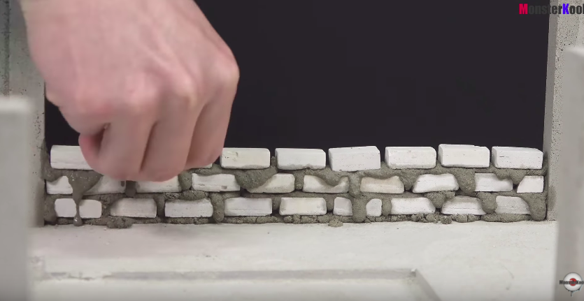 ▼2.砌牆、建樓梯:這棟豪宅的建築外牆是青磚製成的,所以大神找來了灰色的磚頭,仔細砌起一面牆。