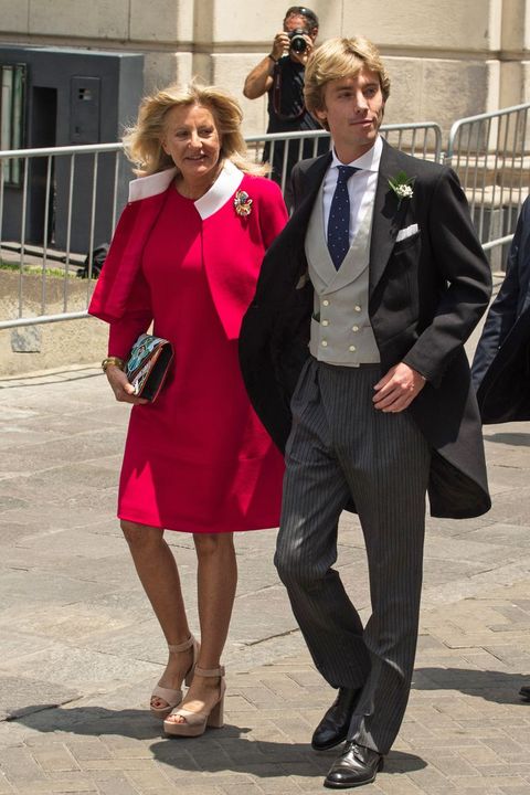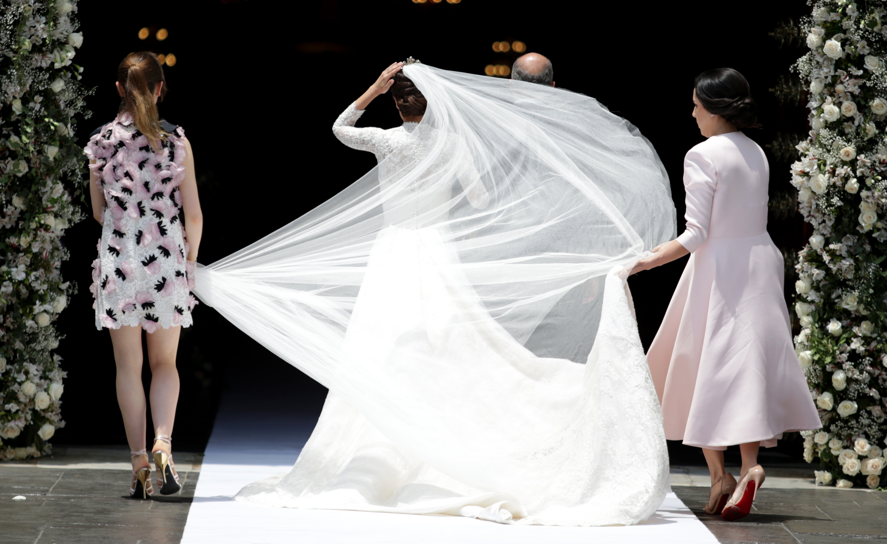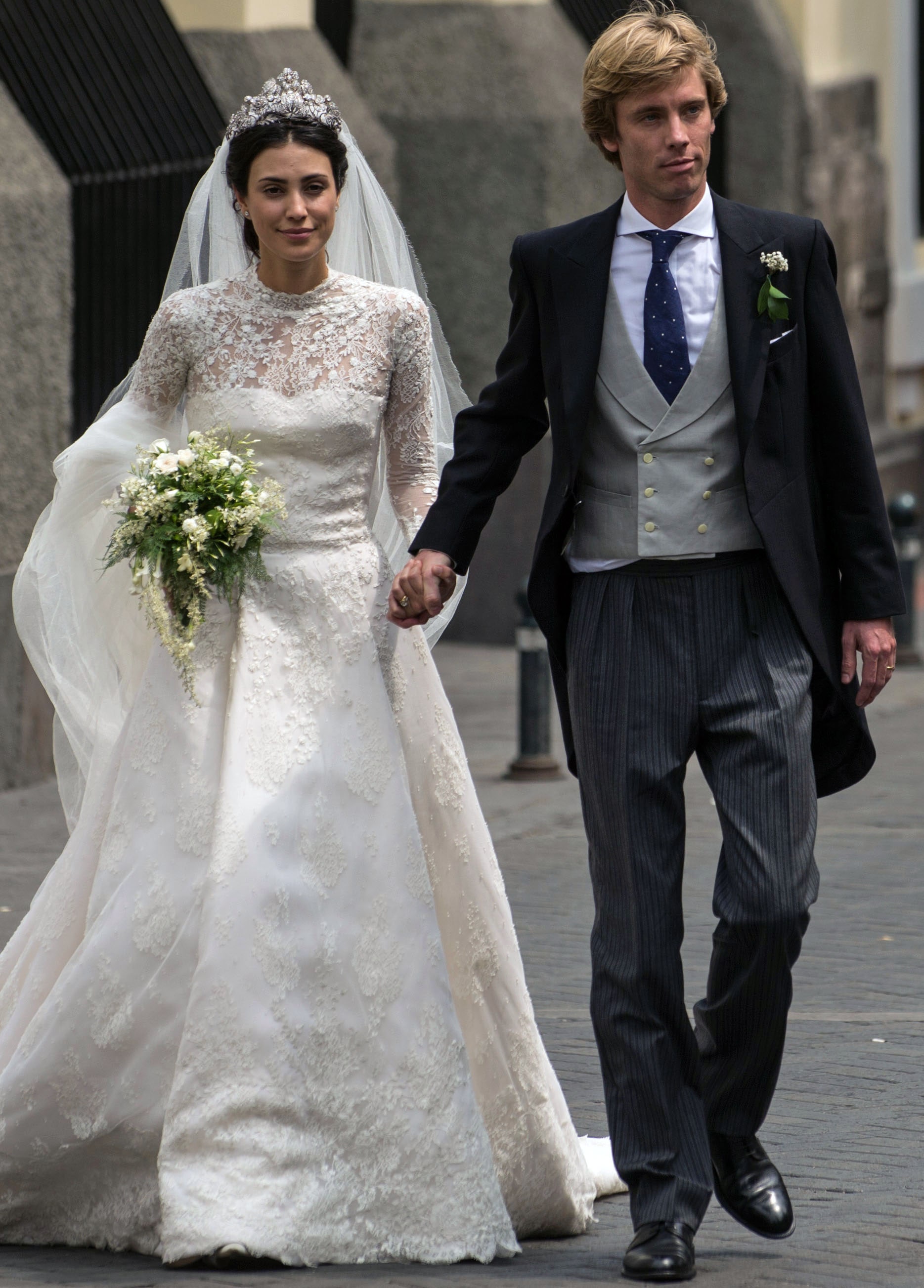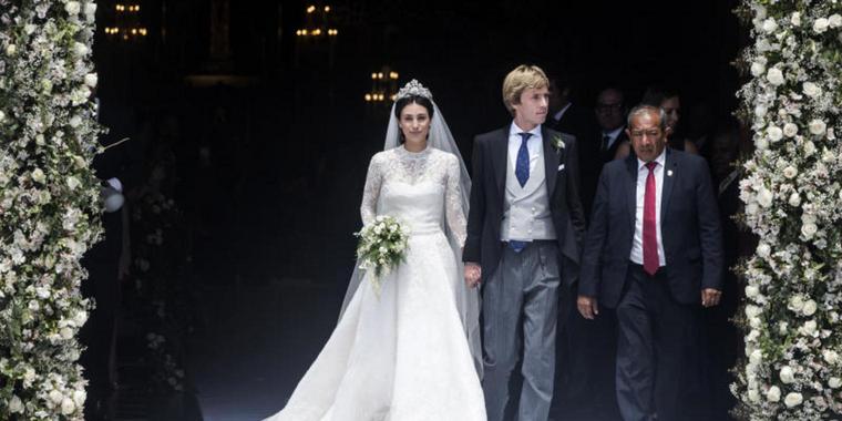 ▼Alessandra穿著高領、長裙擺的白色婚紗,戴著鑽石王冠。王子則穿著燕尾服,配有一條帶有淺色波點的藍色領帶。