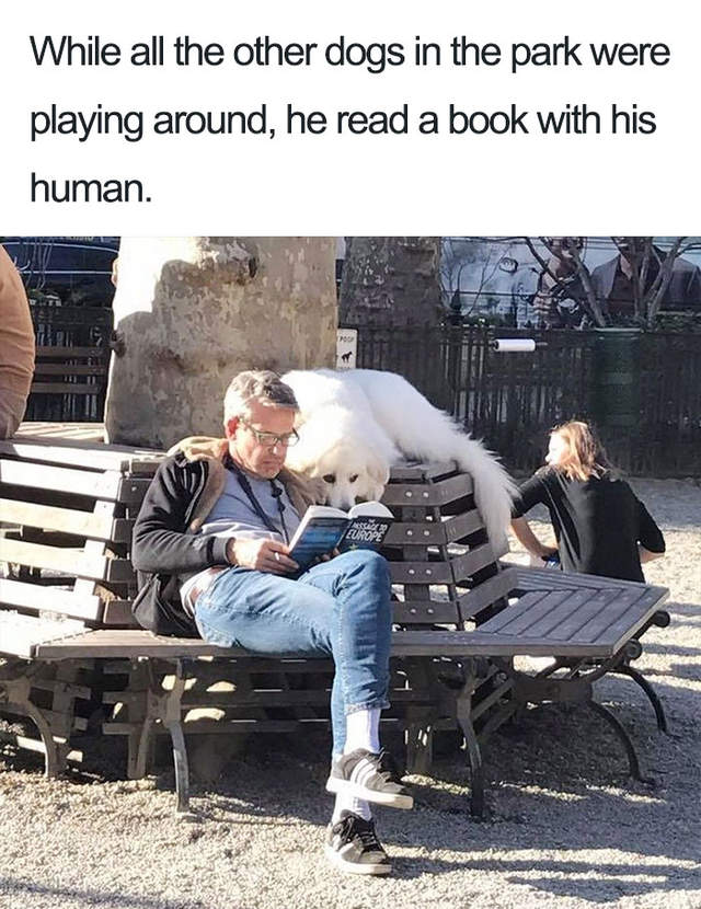 ▼其他的狗狗都在公園玩耍,牠卻選擇了跟主人一起看書。