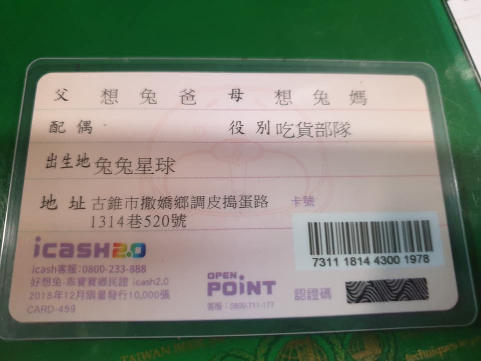 ▼原來當時原po 到電信門市詢問事情,當櫃檯小姐要求他出示身份證件確認身份時,他一時沒留意順手抽出了造型與身份證非常相似的「好想兔 icash 2.0」卡片給櫃檯。