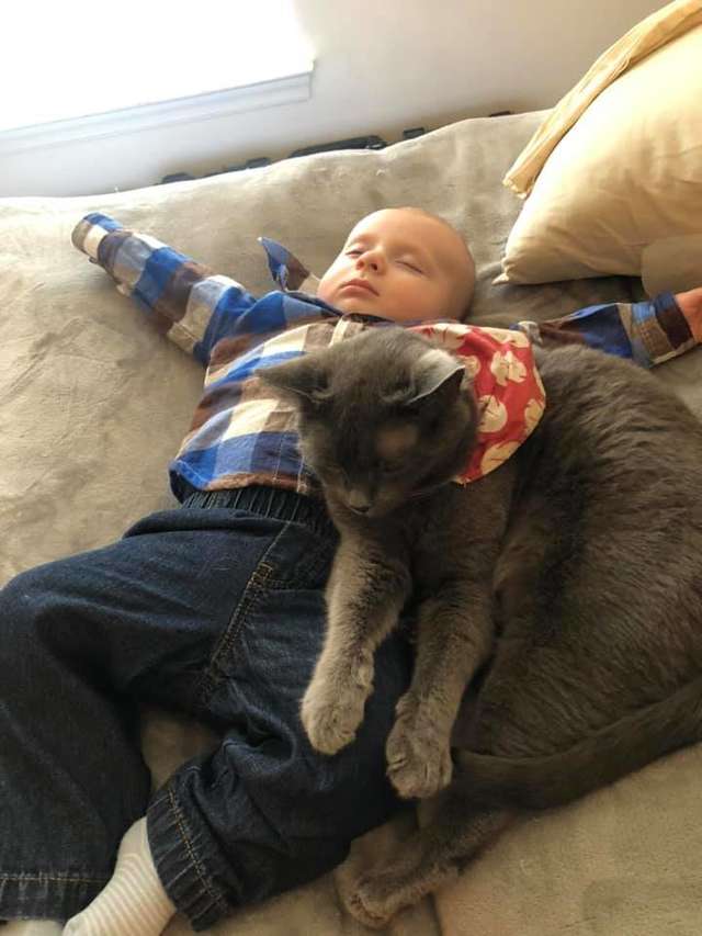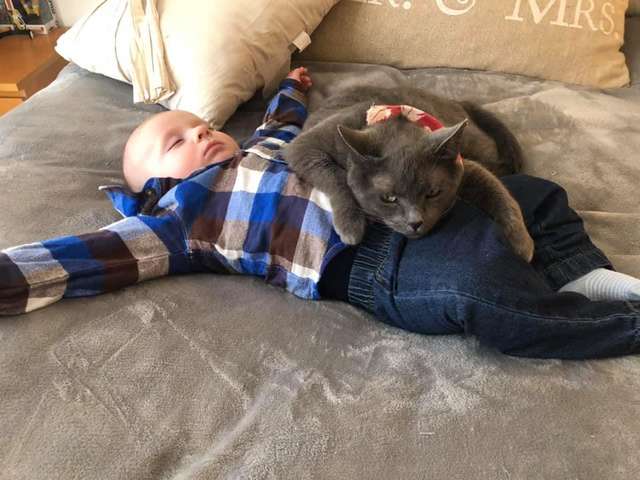 ▼Jeannie表示,家人帶小寶寶出門時,Grace會擋在門口,不讓他們出去。他們回家時Grace會第一個跑到門口迎接。以前牠從來不這樣做,都是很高冷地等待主人過去跟牠玩。Grace最愛跟小寶寶挨在一起睡覺,以前不親人的牠變成了世界上最黏人的貓咪。
