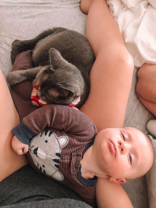 ▼Jeannie懷孕後,家裡人都很好奇貓咪們對小主人會有什麼反應,大家都覺得Grace一定對小寶寶毫無興趣。剛開始確實是這樣的,牠雖然好奇,但離得遠遠的,但6週後一切都改變了。