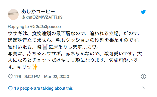ウサギの足の裏には肉球が無いという事を知った。肉球は獲物に気付かれないよう足音を消したり高い所から飛び降りる為のクッションなので、ウサギのような草食動物には必要無かった訳だ。その代わりに足の裏を守る為に厚い毛で覆われていているんだとか。足の裏がもふもふで可愛い。 pic.twitter.com/3y3EbnU8Hy