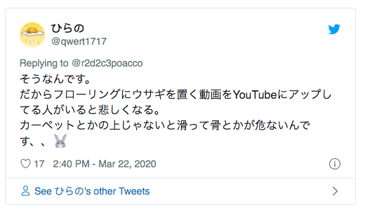 ▼「就因為這樣每當看到Youtube上兔子放在地板上的影片就覺得揪心。如果不是在地毯上,牠腳滑對骨頭也不好。」