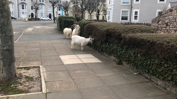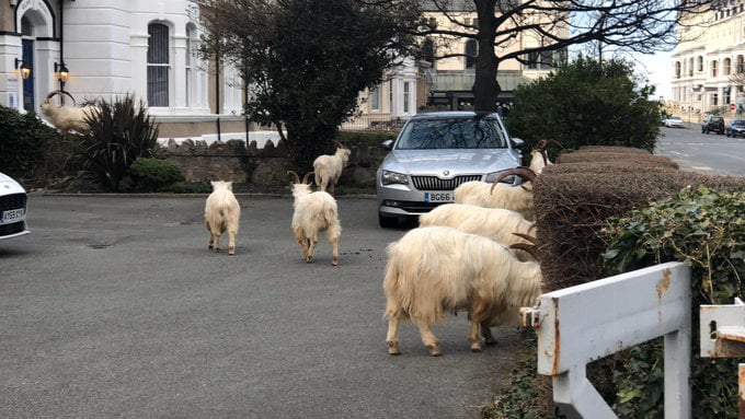 2020年04月02日為防止新冠疫情的蔓延,英國已經開始「封城」,街頭人煙稀少。原本生活在郊外的動物們趁此機會來到城市中,大搖大擺在人類的地盤遊蕩。威爾斯蘭迪德諾(Llandudno)的網友就看到成群山羊在市區逛大街,那畫面有點滑稽,也非常可愛。
