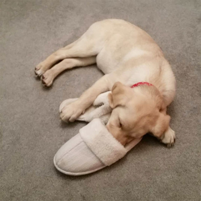 ▼狗狗們聞著主人的味道,就像主人陪在身邊一樣。不過也有一些狗狗只是調皮,想要咬鞋子而已。