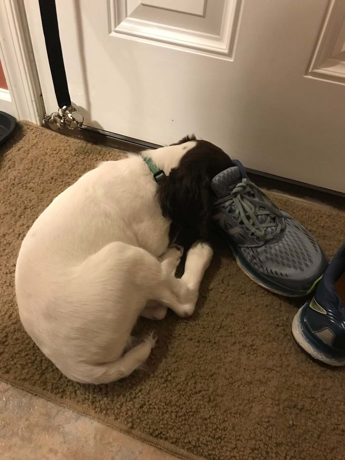 ▼還有一些狗狗是因為太思念主人,所以把鼻子、嘴巴塞進鞋子裡,吸主人的氣味來緩解思念和焦慮。