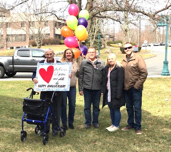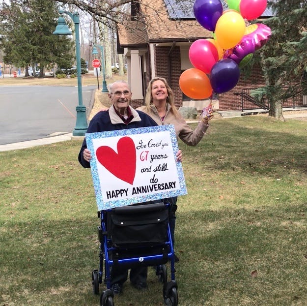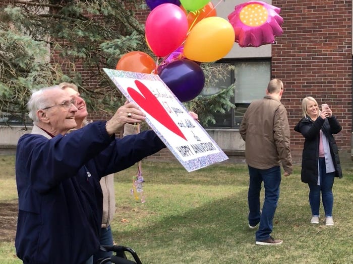 ▼現在護理之家暫停訪客出入,Bob沒辦法進去探望妻子。他非常失落,但也能理解這是為民眾的安全考慮。馬上就要到Bob和Nancy結婚67週年的紀念日了,家裡人一直非常期待這一天的到來。於是Bob想出了一個不用見面也可以共同慶祝的好方法。