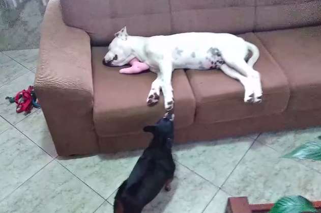 ▼Rodrigo家的其他狗狗對這個新同類非常好奇,一直在旁邊觀察牠。狗狗醒來後一切都改變了。Rodrigo說:「我們家的狗狗都被牠嚇到了。牠非常愛玩,把自己弄得很忙,幸好沒有跟其他狗狗出現問題。」