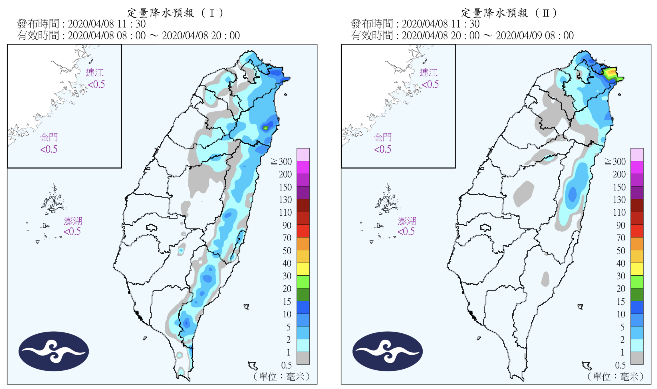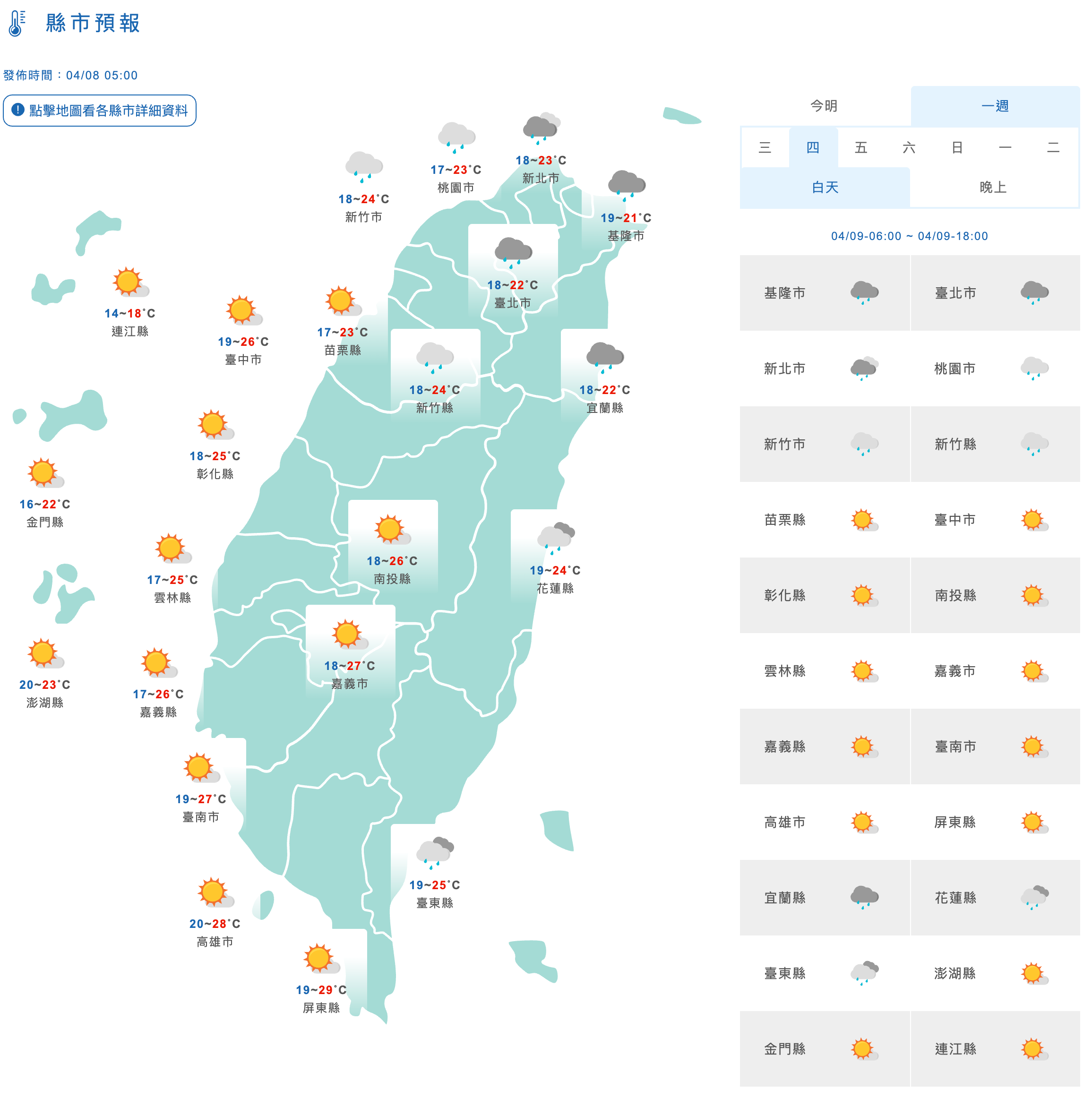 前天、昨天(6、7日)台灣受降雨影響,昨日起水氣逐漸減少,北部、東半部及山區仍有短暫局部陣雨,但是雨勢漸緩。根據天氣預測,中部以北星期三(8日)低溫依舊會落在15、16度附近,高溫不超過23度,南部高溫則會落在27、28度。星期四(9日)新竹以北及東半部宜花東會有陰雨,其他地區多雲到晴,因仍受東北季風影響,北部、東北部偏涼,其他地區日夜溫差較大。