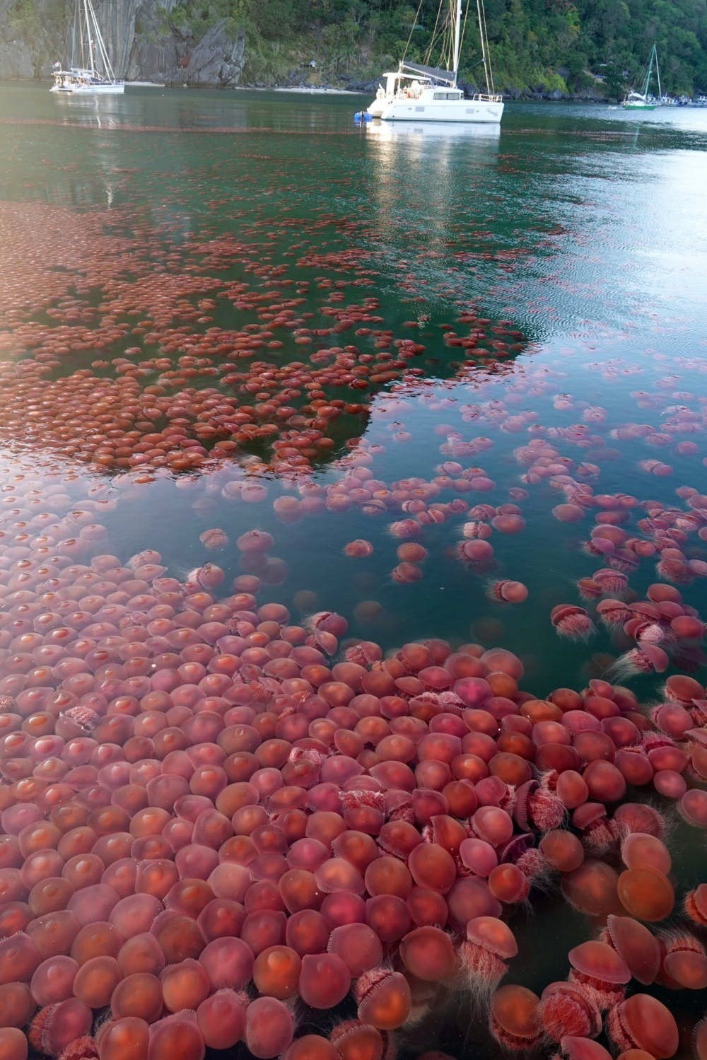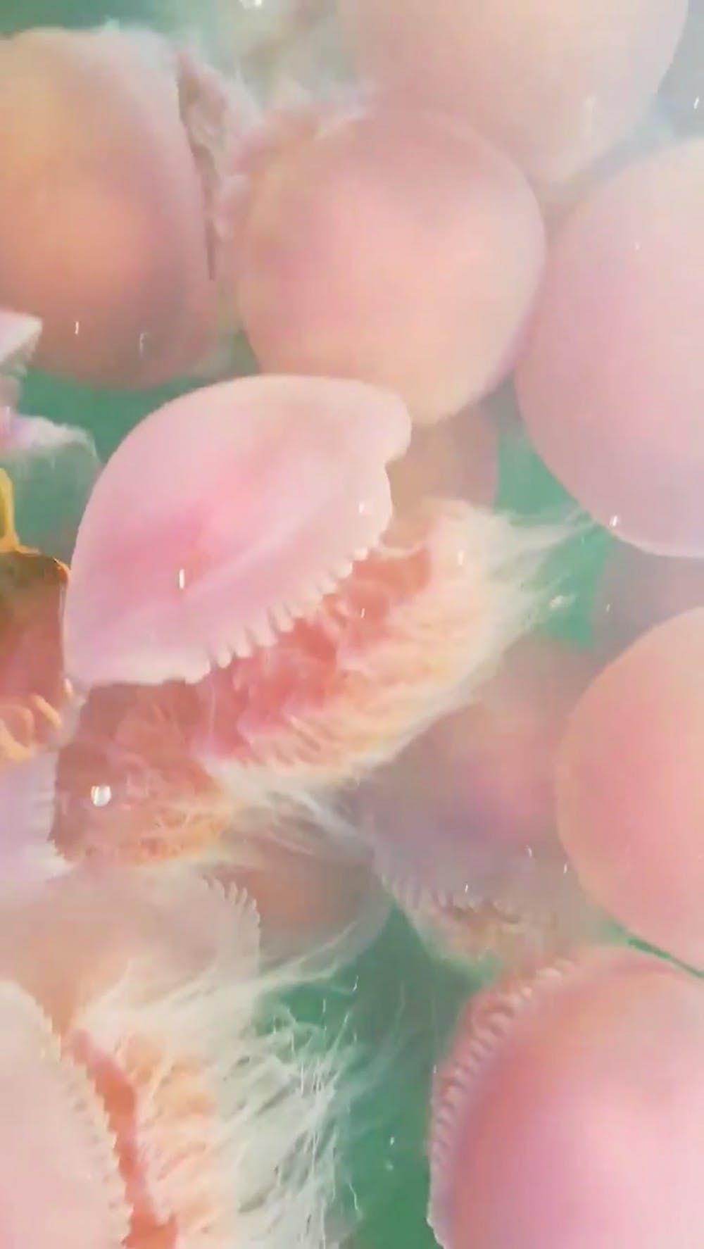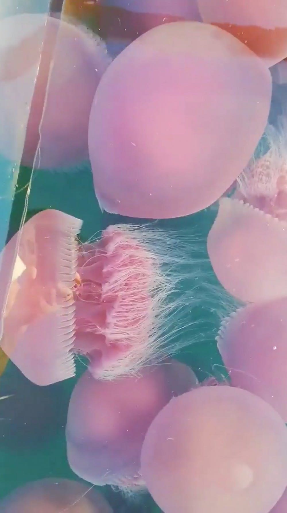 少了人類的影響,動物終於可以自由活動了。那麼多粉紅色水母出現在水面上,看起來太壯觀了。