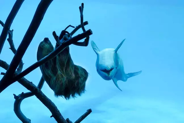 ▼為了滿足動物們跟人類互動的需求,飼育員們不得不加班陪牠們玩,或者介紹不同的動物相互認識,希望牠們能夠成為朋友。德州水族館就安排海豚和樹懶見面,給牠們的生活增添一點樂趣。