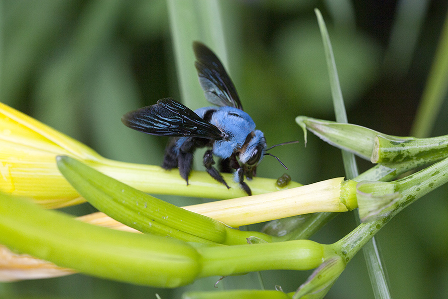 ▼藍木蜂最明顯的特徵就是身上漂亮的藍色。再加上閃耀著紫色金屬光澤的翅膀,在陽光的照射下非常美。雌蜂的外表更加時尚,而且有毒刺;雄蜂體型略小,沒有刺,毛色更淺,呈灰藍色。
