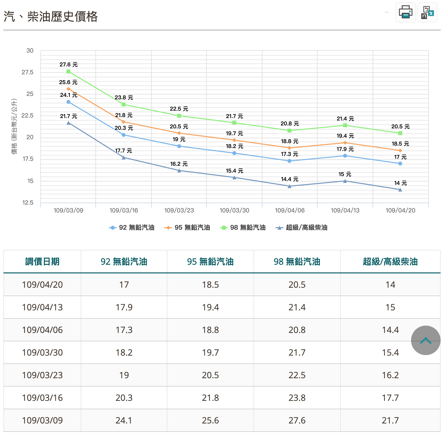 2020年04月24日全球受到新冠影響,石油期貨價格在西德州中級原油(WTI)收價-37.63美元,史上首見負油價創了歷史紀錄。因應國際油價的波動,對此根據中油油價調整的機制推算,下週每公升汽、柴油將再向下調降,預計會各降1元、1.1元,將創下20年來國內新低油價紀錄。