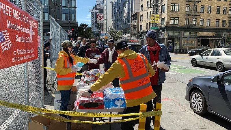 2020年04月26日每天下午1點,「立祉基督基金會」(LFG)負責人George Lam都會帶著幾位志工來到舊金山的田德隆區,向遊民們免費派發午餐。從今年元旦開始,他們每天都會派發約100份便當,來幫助有需要的人。65歲的華裔老人George Lam表示,他們準備堅持一年,而且風雨無阻。