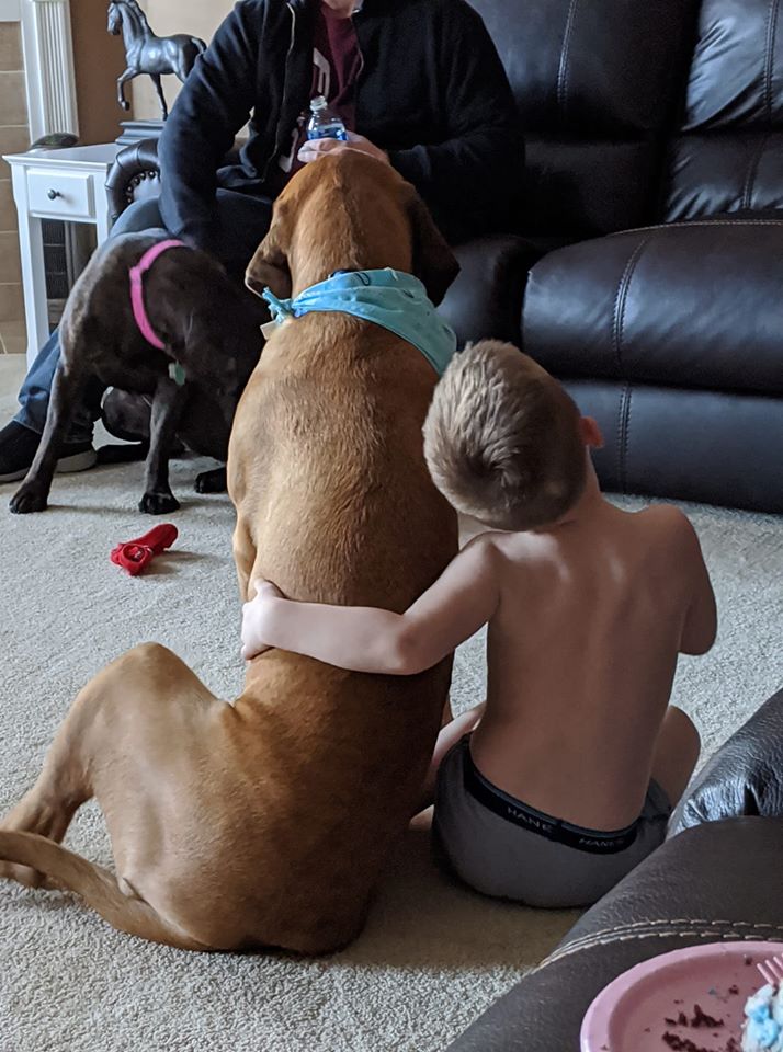 ▼Dash一臉無奈,似乎能感受到小主人低落的心情,Peyton則伸出手撫摸牠的頭。他們互相鼓勵,感情深厚。