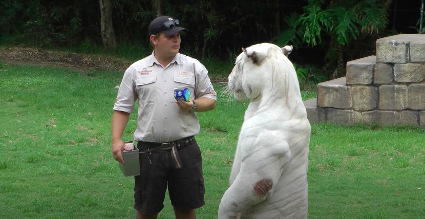 ▼這隻老虎本來趴在草地上休息,飼育員拿著一盒牛奶過來,牠立刻起來討奶喝。飼育員舉起牛奶,老虎順勢用後腿站立,伸長脖子喝奶。
