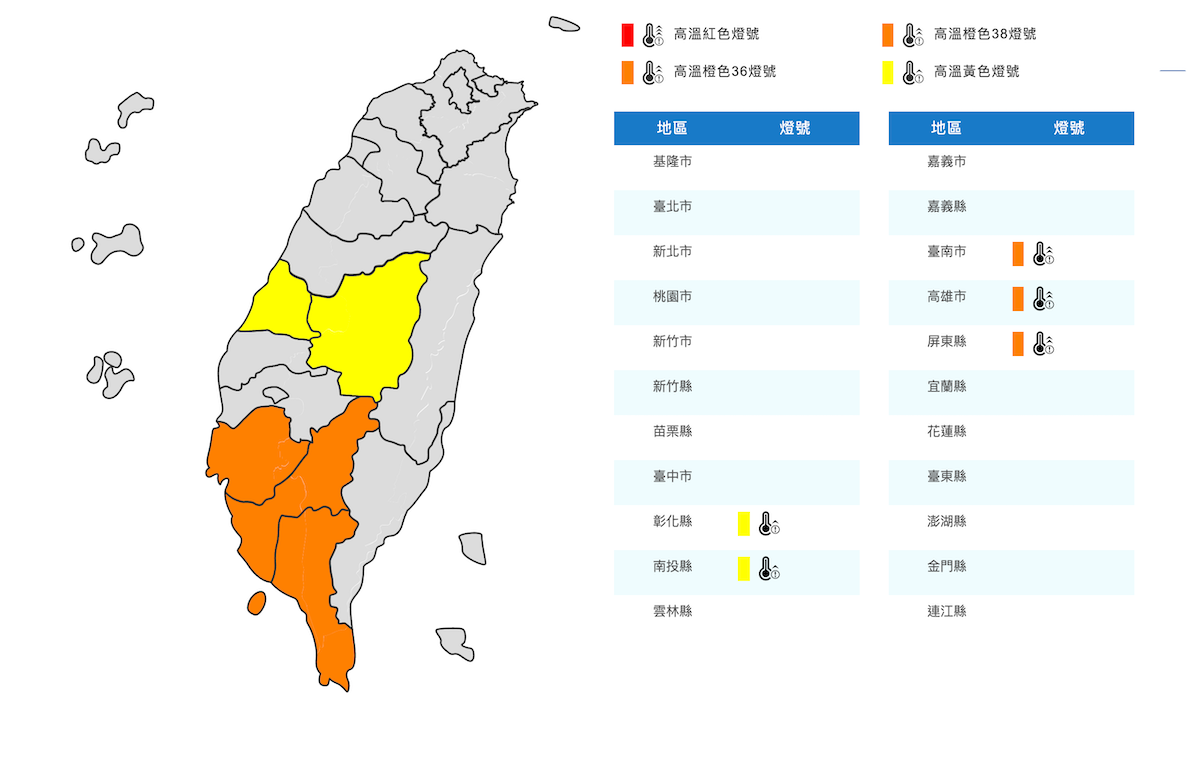 ▼由於台灣在3、4日環境轉為西南風,各地白天都會持續溫暖。大台北和中南部都會達到32以上的高溫,其中受到西南風沈降影響,台南市、高雄市、屏東縣都屬於高溫燈號地區,有可能達到36度的氣溫。