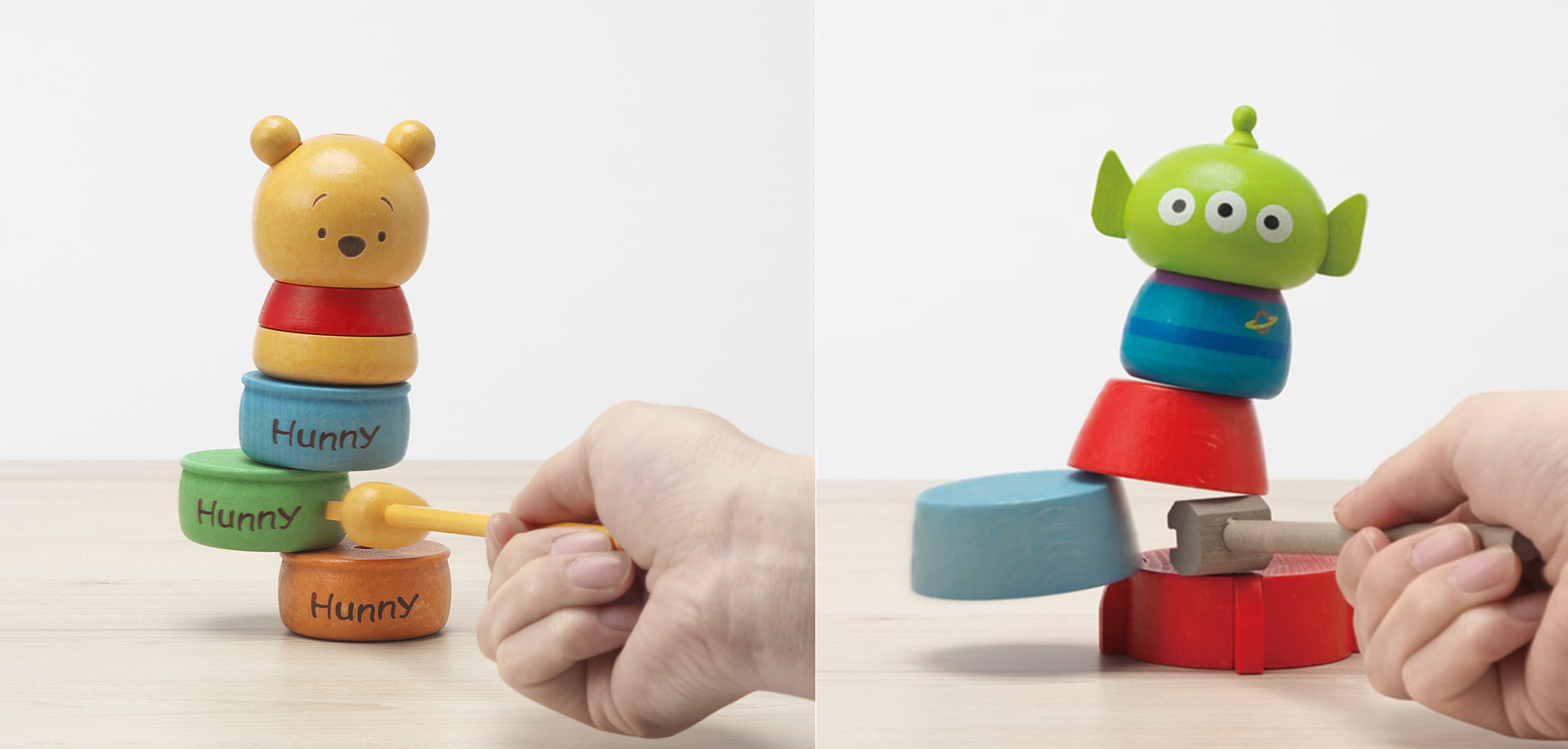 ▼Yanoman推出的以兩款迪士尼經典角色「小熊維尼」和「三眼仔」的「敲敲樂積木組」,兩款都是以木頭為材料製成,拿在手上可以感受一下木頭獨特的厚實、舒服的質感。