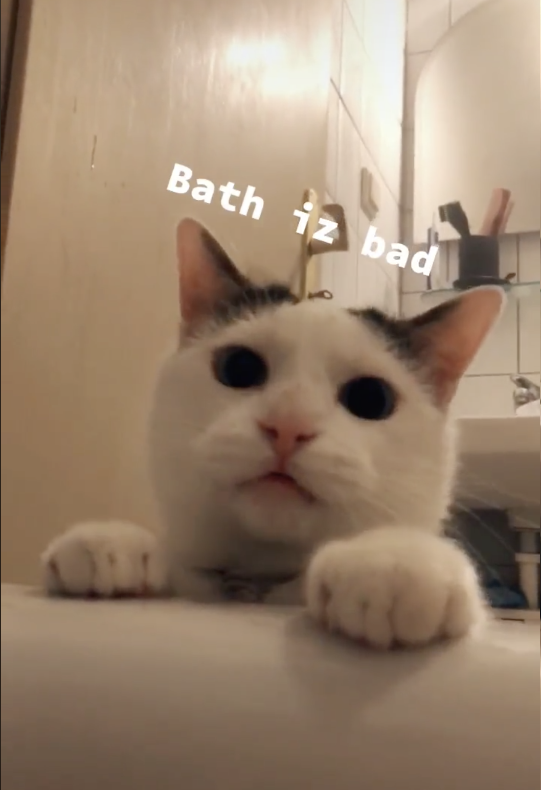 ▼這段Bello攀上浴缸邊緣與人喵喵對話的影片,再加上幽默的字幕搭配表現,讓Bello獲得了許多網友的讚。Bello還是很擔心他的人類夥伴的「用水」的安全,主人在浴缸泡澡的時候,常常都回過來探頭關心,非常的貼心。