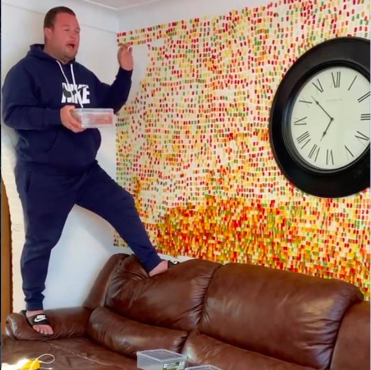 2020年05月28日最近這段時間,倫敦32歲老爸Nick Smith居家自主健康管理,妻子Jess讓他好好裝潢一下客廳,把客廳的牆壁佈置得更「高雅」。Nick欣然答應,然後他找來6,000顆小熊軟糖,全都黏在了牆壁上。Jess看到這一幕徹底呆掉了~