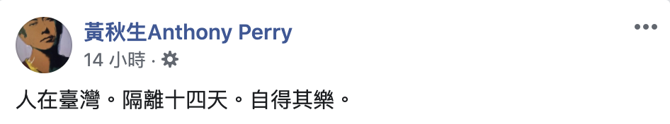▼黃秋生在他的個人臉書上Po上一張書法照,並表示自己「人在台灣。隔離十四天。自得其樂。」就有網友熱情邀請他「入籍台灣吧」,而他也給予了正面的回覆:「準備中」,表達他的確有準備入籍台灣的計畫。