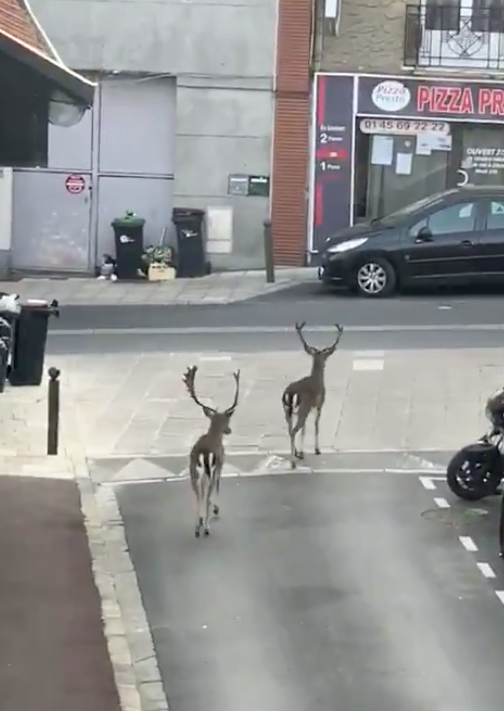 ▼巴黎封城期間,除了小狐狸,還有其他動物到城市來狂歡,比如馴鹿們就來逛街了。這2隻馴鹿原本生活在附近的城堡裡,雖然平時也會跑出來玩,但這是第一次跑到市中心來散步。