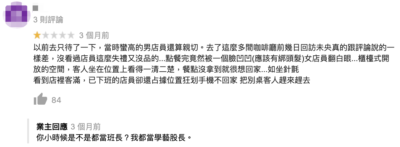 ▼但也有網友表示店家這樣的回覆,會讓他更想要親自上門拜訪這間咖啡店了,因為感覺一定很有趣;也有網友留言店家這樣的回應,真的是「大快人心」;更有網友表示先留評價,之後一定會帶全家大小親自光顧捧場;也有人留言欣賞店家老闆不亢不卑的態度,表達支持店家。
