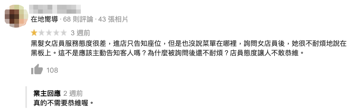 現在餐廳店家對於網路社群的操作相當的在意,尤其Google地圖的評價系統往往是顧客評斷要不要上門用餐的一大指標,所以許多店家會非常在意顧客給予的一星評價。但是有一間店家卻反其道而行,就有網友發現他們對於給予一星評價的回覆,相當的直率嗆辣!