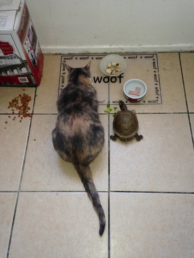 ▼烏龜想跟上貓咪的進食速度很不容易吧。