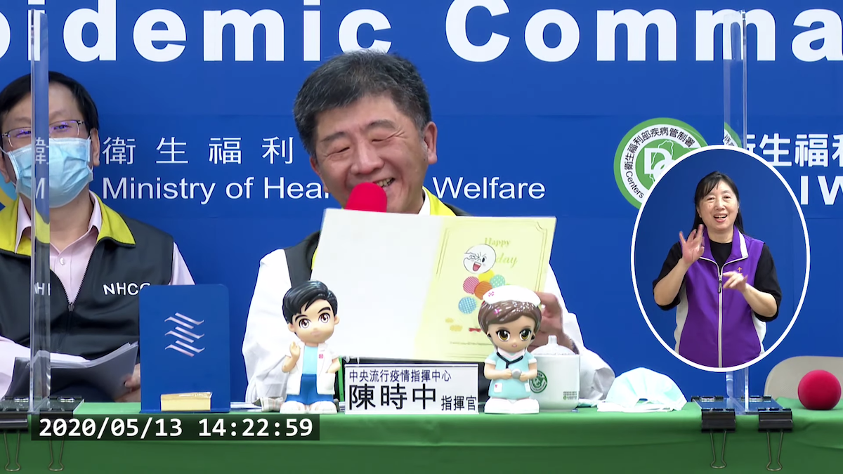 中央指揮中心指揮官陳時中在5月13日的記者會上分享了一張卡片來信,卡片是由一對小姊妹所寫的,並隨信附上一對「醫護人員娃娃存錢筒」,存錢筒裡存有她們從家中長輩那邊所得到的零用錢,想一起送給阿中部長,讓他每天看著它們心情也會變好。