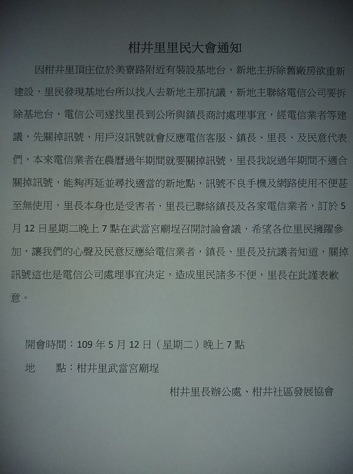 2020年05月15日在彰化和美鎮柑井里的居民因為不滿住家附近建有基地台,所以向建基地台土地的地主的反應,希望移走基地台,在被地主反應過後,3家基地台電信業者決定一起將訊號關閉,這一舉動也瞬間讓當地居民回到了幾乎無網路的「原始生活」,在斷訊經過7天後,5月12日晚間柑井里召開了里民大會,經過里民的投票同意後,電信業者也同意再將訊號重啟,讓當地居民再度重回到「滿格」的生活。