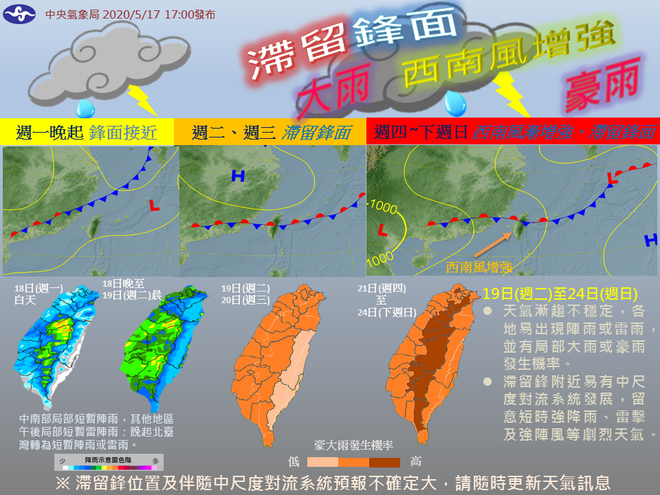 ▼根據中央氣象局報導,滯留鋒面將於週一晚間起接近,週二週三正式報導,並且一連數日都會在台灣附近徘徊;而週四到週日期間,除了有滯留鋒面外,更因西南風增強,引發強烈對流,會造成「劇烈天氣」:包含短時強降雨、落雷、強陣風等。