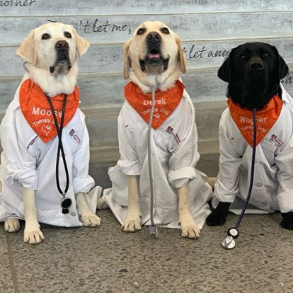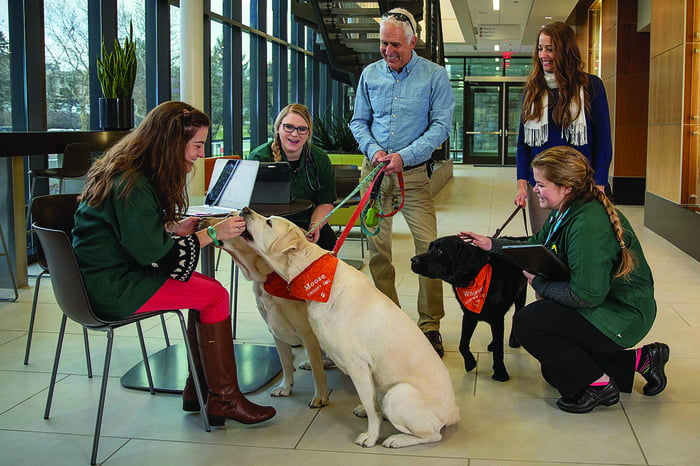 ▼今年2月Moose被診斷出前列腺狀況,經過治療後有所好轉。現在牠已經能夠跟另外3隻治療犬,Derek、Carson和Wagner,繼續為學生們服務了。