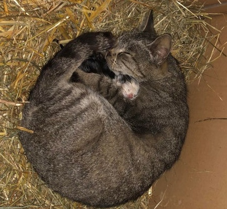 ▼貓媽媽抱著自己剛剛出生的寶寶。