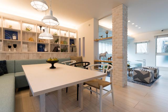 ▼客廳的另一側是餐廳,沒有傳統的桌椅,而是換成了卡座式沙發,就像那些時尚的餐廳一樣。後面的背景牆也是開放式的,可以擺放不少物品。