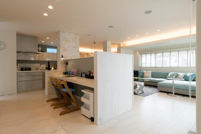 ▼電視牆的另一邊是小書桌,左側則是開放式廚房,父母準備料理的時候還能監督孩子做功課。