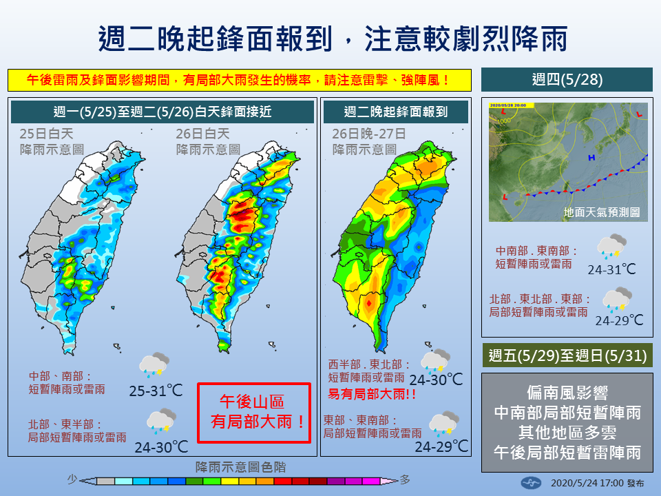 2020年05月25日星期一(5月25日)全台除東半地區、恆春半島有局部短暫陣雨外,其他為多雲到晴好天氣,氣溫上看30多度,大台北地區和其他山區會有午後短暫雷陣雨;但是星期二(26日)梅雨鋒面又再度靠近,中南部地區和離島澎湖、馬祖、金門會有局部短暫陣雨或雷雨,其他地區午後會有局部短暫雷陣雨,山區會有局部大雨機率發生。